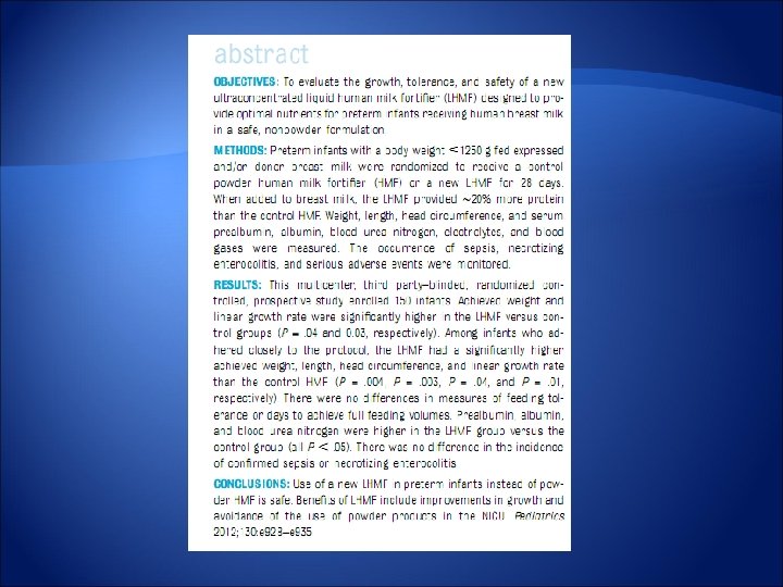 O uso do FLHL, embora é de natureza ácida, não causou alterações no p. H e HCO-3 de forma clinicamente significante Limitação do estudo: desconhecimento do conteúdo real de proteína do leite humano usado no estudo Os autores estimaram a proporção de proteína; energia do LHFL variou de ~3, 2 a 4, 0 g/100 kcal (2, 1 -2, 7 g/100 ml) Os fortificantes em pó disponíveis diluem somente marginalmente fatores de defesa do LH. No entanto, eles não são comercializados de forma estéril