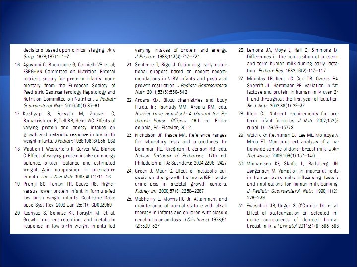 DISCUSSÃO O uso do LHFL (leite humano fortificado líquido) mostrou melhor crescimento em relação ao LHFP (leite humano fortificado em pó) A recomendação atual de proteínas para os RN<1000 g é de 4, 0 a 4, 5 g/kg/dia (3, 66 -4, 1 g/100 kcal) (referência 16) Senterre e Rigo recentemente tem mostrado a eficácia em prover maior oferta protéica via nutrição parenteral nas primeiras semanas de vida para estes recém-nascidos (referência 21)