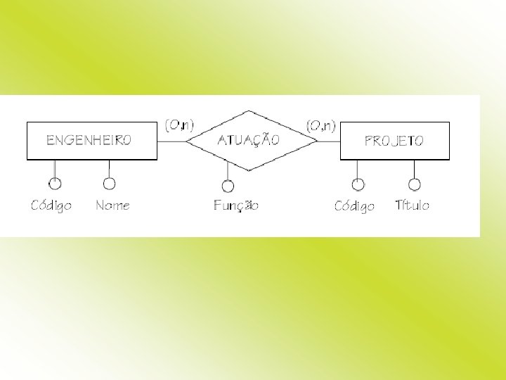• Cada disciplina possui exatamente um departamento responsável, e um departamento é responsável por muitas disciplinas, inclusive por nenhuma. • Uma disciplina pode possuir diversos pré-requisitos, inclusive nenhum. Uma disciplina pode ser prérequisito de muitas outras disciplinas, inclusive de nenhuma. • Uma disciplina pode aparecer no currículo de muitos cursos (inclusive de nenhum) e um curso pode possuir muitas disciplinas em seu currículo (inclusive nenhuma). • Um aluno está inscrito em exatamente um curso pode ter • nele inscritos muitos alunos (inclusive nenhum).