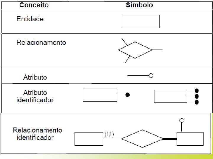 Os três elementos fundamentais que fazem parte do MER Entidade – representação abstrata de objetos de interesse do sistema no mundo real do qual você deve armazenar informações. Atributo – tipo de informação elementar que deve ser armazenada de cada entidade, representando uma propriedade ou um relacionamento entre elas. Relacionamento – representa uma associação entre entidades