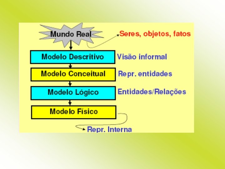 Modelagem de Dados Usando o Modelo Entidade. Relacionamento (MER) O MER é usado principalmente durante o processo de projeto da base de dados. No projeto conceitual, você elabora o modelo conceitual do BD, ou seja, a representação de elementos do mundo real (entidades e seus atributos) e os relacionamentos existentes entre eles. Este modelo de alto nível facilita a compreensão do ambiente real do usuário sem estar vinculado a nenhum modelo tecnológico de BD. Representa as propriedades estáticas do sistema, definindo a estrutura do BD em alto nível.