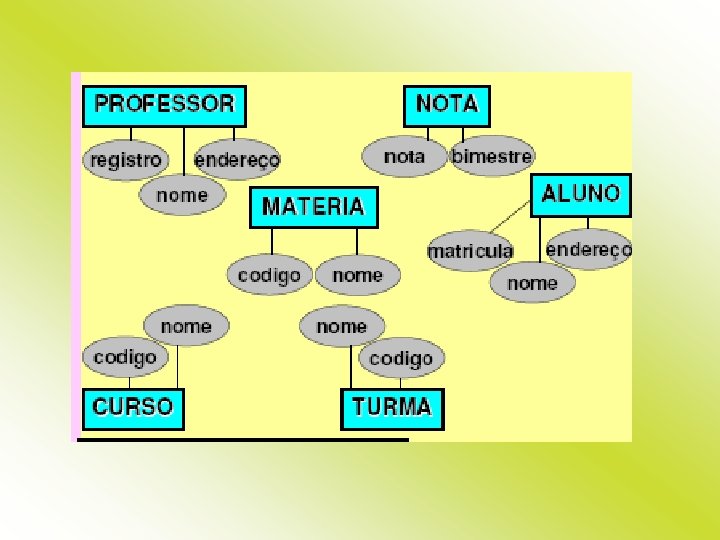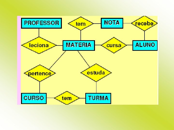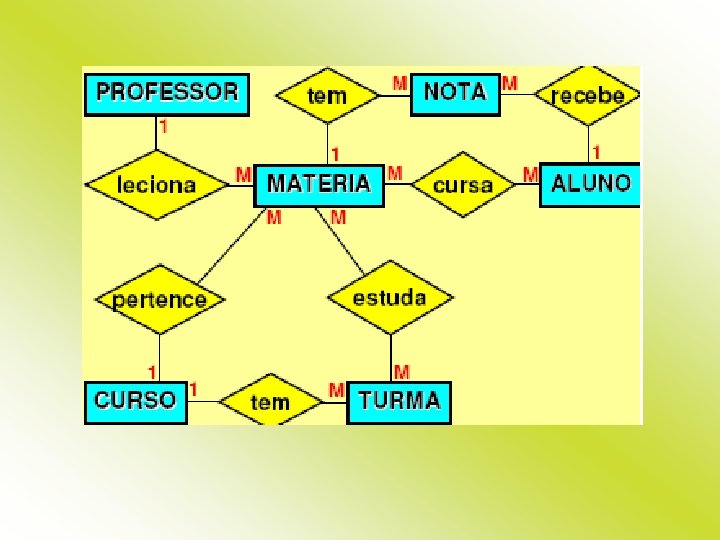 Cardinalidade Uma nota pertence a apenas um aluno. Um aluno possui muitas notas. Então: um aluno – muitas notas. Um aluno cursa muitas matérias. Uma matéria é cursada por muitos alunos. Então: muitos alunos – muitas matérias. Uma matéria tem muitas notas. Uma nota pertence a uma matéria. Então: uma matéria – muitas notas. Um professor leciona muitas matérias. Uma matéria é lecionada por apenas um professor. Então: um professor – muitas matérias. Uma turma tem muitas matérias. Uma matéria é ligada a muitas turmas. Então: muitas turmas – muitas matérias.