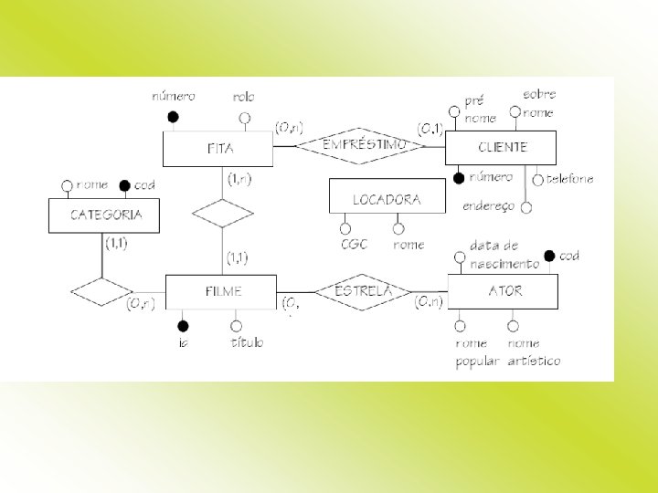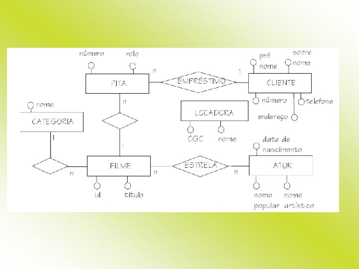 Estudo de caso - Locadora de vídeos Uma pequena locadora de vídeos possui ao redor de 2. 000 fitas de vídeo, cujo empréstimo deve ser controlado. Cada fita possui um número. Para cada filme, é necessário saber seu título e sua categoria (comédia, drama, aventura, …). Cada filme recebe um identificador próprio. Para cada fita é controlado que filme ela contém. Para cada filme há pelo menos uma fita, e cada fita contém somente um filme. Alguns poucos filmes necessitam duas fitas. Os clientes podem desejar encontrar os filmes estrelados pelo seu ator predileto. Por isso, é necessário manter a informação dos atores que estrelam em cada filme. Nem todo filme possui estrelas. Para cada ator os clientes às vezes desejam saber o nome real, bem como a data de nascimento. A locadora possui muitos clientes cadastrados. Somente clientes cadastrados podem alugar fitas. Para cada cliente é necessário saber seu prenome e seu sobrenome, seu telefone e seu endereço. Além disso, cada cliente recebe um número de associado. Finalmente, desejamos saber que fitas cada cliente tem emprestadas. Um cliente pode ter várias fitas em um instante no tempo. Não são mantidos registros históricos de aluguéis.