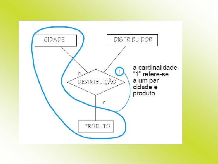 Na linha que liga o retângulo representativo da entidade DISTRIBUIDOR ao losango representativo do relacionamento expressa que cada par de ocorrências (cidade, produto) está associado a no máximo um distribuidor.