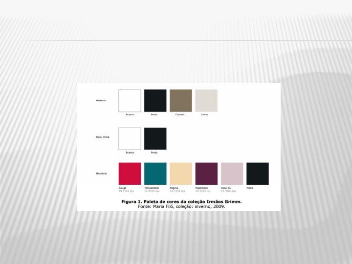 - DIVISÃO DOS TEMAS DOS IRMÃO GRIMM � � � MISTÉRIO: Tecido sedutor, chiffons, rendas, tules, tafetás e veludo em vestido rodados, cintura marcada e suave transparência. Bordados ricos, meias, rendadas e perolas. ROCK CHICK: Jeans, botas, jaquetas, caveiras, couro e metais. As Calças justíssimas, skinnies ou leggings. Volume na parte de cima, com ricos detalhes na gola e punhos. Um ar masculinizado com variações de estilo bem sexy. MEMÓRIA: Imagem dos contos de fada. Com trabalhos artesanais e misturas inusitadas. Sapatos boneca, polainas, lenços, chapéus e cintos. Cores mais saturadas e variação ampla de tonalidade, com uma forma feminina e delicada.