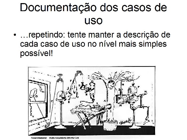 Documentação de casos de uso – boas práticas • Não se preocupar com a interface gráfica durante a escrita • Não se preocupar com detalhes técnicos, a serem preenchidos posteriormente • Manter a descrição de cada caso de uso no nível mais simples possível.