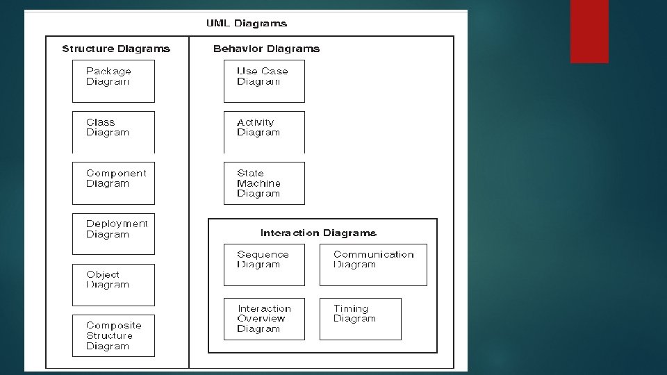 Behavior Diagram Use case diagram Activity diagram State machine diagram Interaction diagrams Sequence diagram Communication diagram Interaction overview diagram Timing diagram