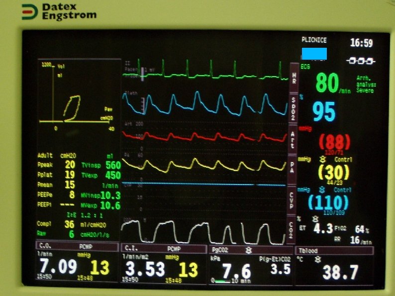 Monitorace během UPV Sp. O 2, EKG, dech. frekvence, NIBP / IBP Kapnometrie acidobazická rovnováha (p. H, pa. CO 2, pa. O 2) kapilární / arteriální krev; Soulad s ventilátorem prokrvení, barva kůže Parametry ventilace (Pi, Vt, f, fi. O 2) obstrukce DC, zalomení, netěsnost, rozpojení okruhu.