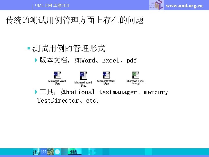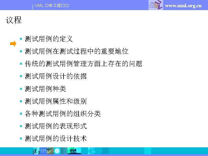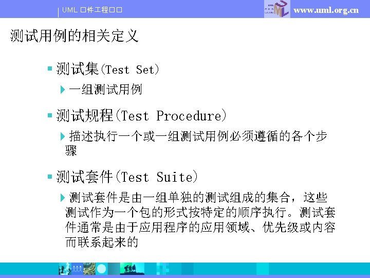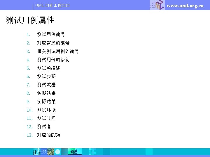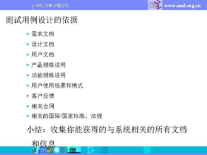 UML �件 程�� Test Case Specification § IEEE Std. 829 -1998 for Software Test Documentation Template for Test Case Specification § Contents 1. Test Case Specification Identifier 2. Test Items 3. Input Specifications 4. Output Specifications 5. Environmental Needs 6. Special Procedural Requirements 7. Inter-Case Dependencies www. uml. org. cn