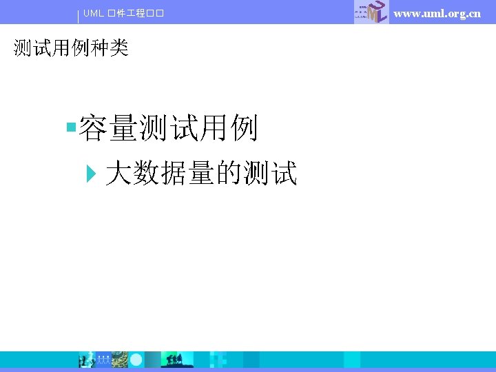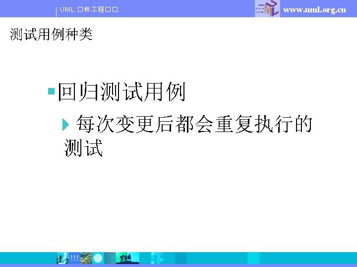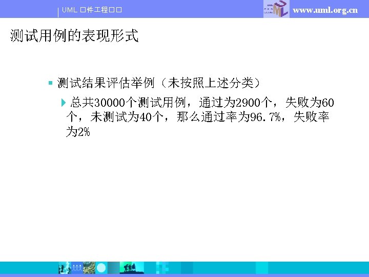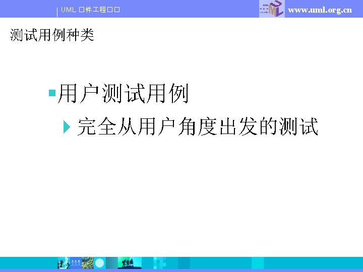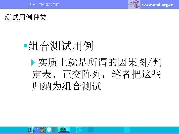 UML �件 程�� www. uml. org. cn 测试用例的设计技术 § 小结: § Each browser is tested with every plug-in, with every server, and with every operating system. § Each plug-in is tested with every browser, every server, and every operating system. § Each server is tested with every browser, every plug-in, and every operating system. § Each operating system is tested with every browser, every plug-in, and every server.
