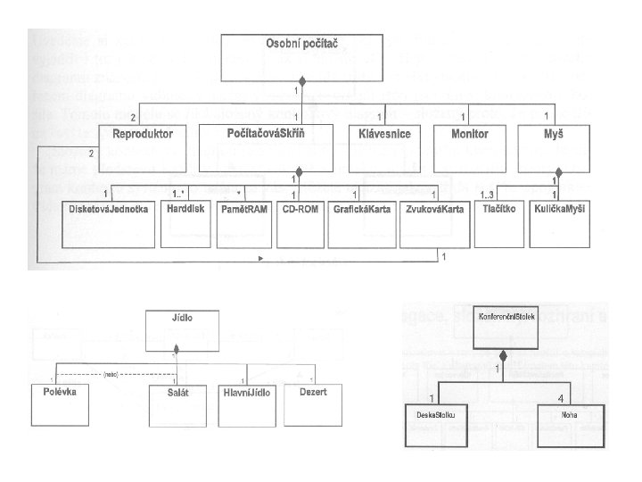 Agregace (seskupení) • • jednou z nejčastějších binárních asociací objekt je vytvořen z dalších objektů = je agregátem množiny objektů Příklady: • objekt Stádo je agregátem Ovcí, • Les je agregátem Stromů, • Rodina bude agregátem objektu typu Muž, objektu typu Žena a množiny objektů Dítě • Předmět se může skládat z Přednášek, Cvičení, Zápočtové_úlohy, Zkoušky atd. agregace je více než pouze součet svých částí, vzniká něco nového (agregát) −agregát může vystupovat v některých operacích jako samostatná jednotka − části mohou existovat samostatně, mohou být součástí dalších agregací v UML se agregace znázorňuje prázdným kosočtvercem na straně agregátu: