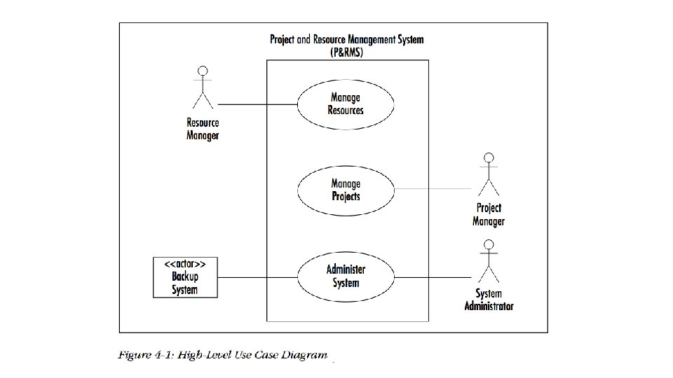 Project and Resource Management System • A resource manager manages resources • A project manager manages projects • A system administrator is responsible for administrative functions of the system • A backup system houses backup data for the system