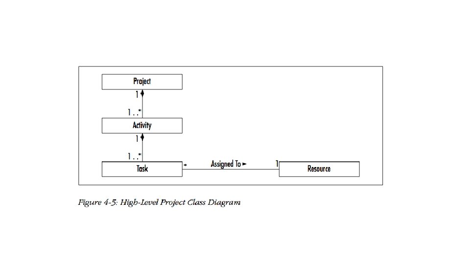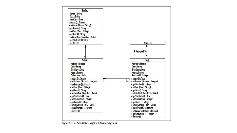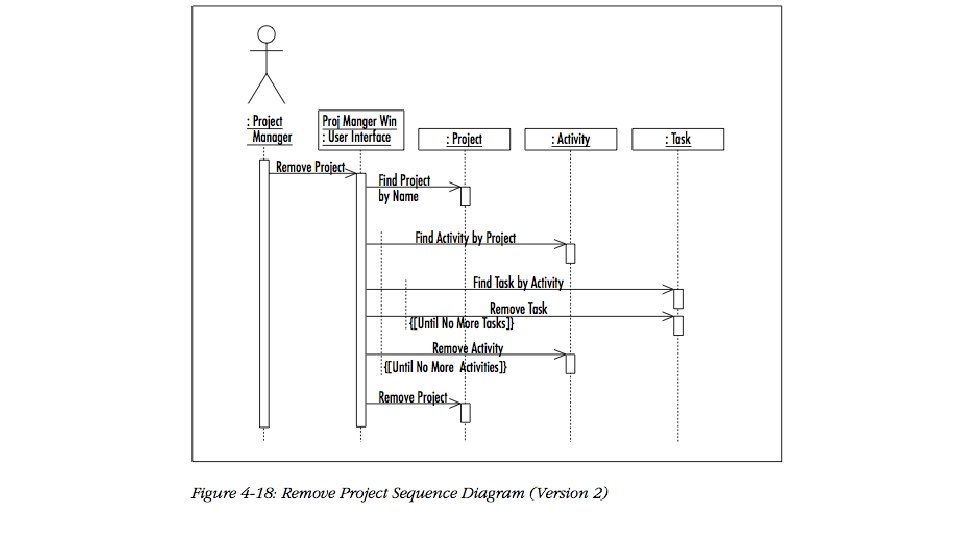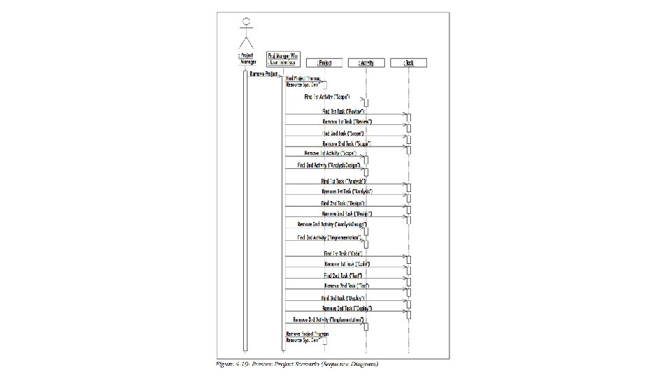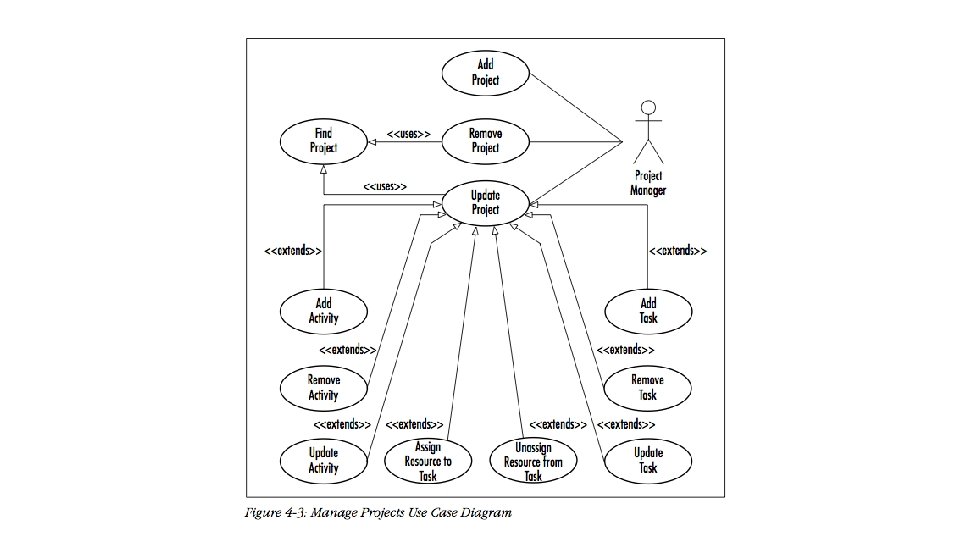 Manage Project Use Case • A project manager can add, remove, and update a project • Remove and update project requires to find project • A project update may involve • Add, remove, or update activity • Add, remove, or update task • Assign resource to a task or unassign resource from a task
