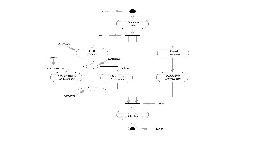 Activity Diagrams • Reincarnation of flow charts • Uses flowchart symbols • Emphasis on control-flow