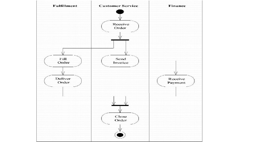Activity Diagrams • Swimlanes: responsibility of one or more objects • Action states: steps in the execution of an algorithm • Action flows: relationship between the different action states • Object flow: utilization of objects by action states