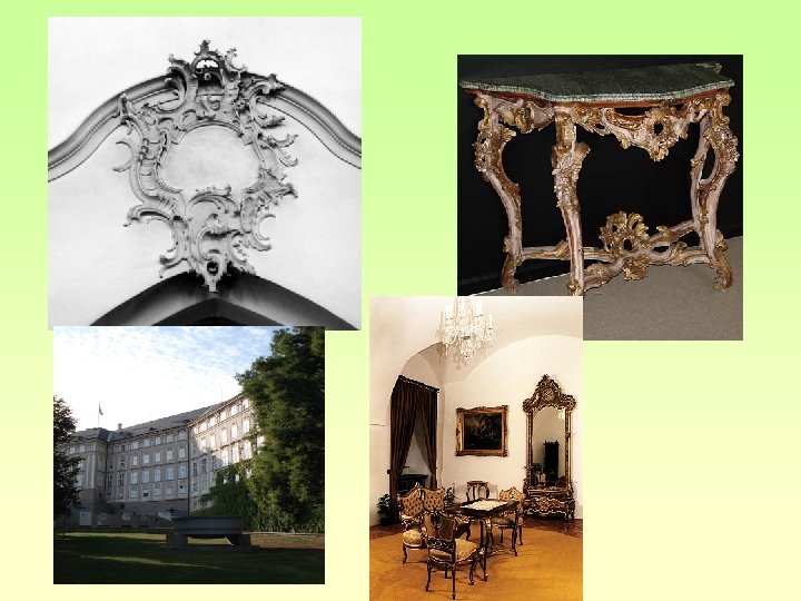 rokoko • baroko přechází v rokoko v l. 1740 - 1770 • (rocaille = nesouměrná mušle) • zdrobnělé baroko / hravost / nesymetrický ornament / elegance • snaha vytvořit příjemné životní prostředí /výzdoba interiérů /záliba v drobných uměleckých předmětech (porcelánové figurky, žánrová malba, rytiny) • Praha - tereziánská přestavba Hradu (architekt N. Pacassi)