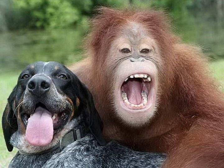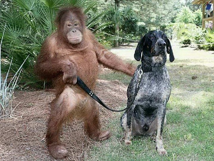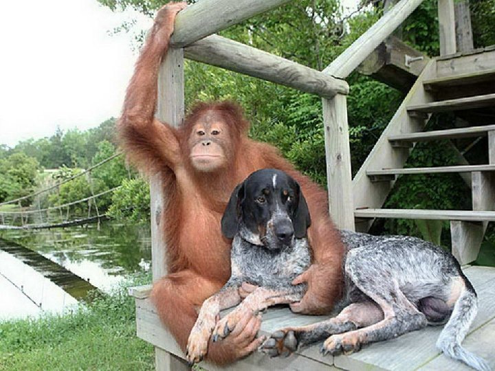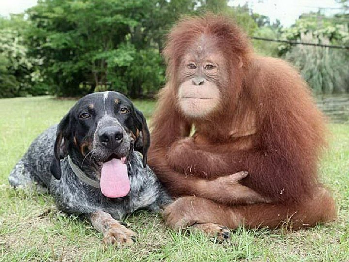 Orango orfano che a tre anni era così depresso che ha rifiutato tutti gli alimenti e il trattamento. I veterinari avevano intuito che stava per morire! Hanno scelto un vecchio cane perso in prossimità dello zoo e l’ourang-utan era presente quel giorno in sala di trattamento. Sono diventati amici inseparabili L'orango improvvisamente aveva una ragione per vivere ed accompagnava il suo nuovo amico in tutte le sue attività. Vivono nel nord della California, il nuoto è il loro sport preferito, anche se Roscoe (l'orango) ha sempre paura dell'acqua e ha bisogno del suo amico per nuotare. Sono ancora insieme e nel vederli contenti si può intuire la loro felicità. . . L'amicizia permette loro di vivere nella gioia, qualcosa che l'uomo non sarebbe riuscito!