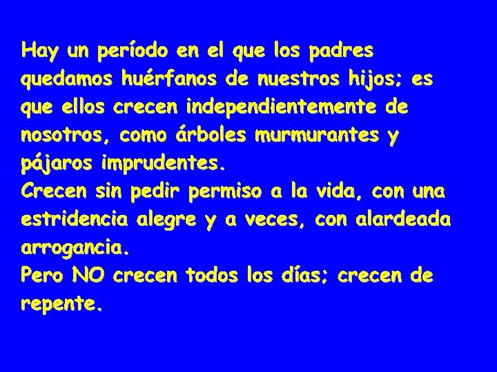 Ahora estas ahí, en la puerta de la disco, esperando ansioso, no sólo que no crezca, sino que aparezca. . . Allí están muchos padres al volante, esperando que salgan zumbando sobre patines, con sus pelos largos y sueltos. Y allí están nuestros hijos, entre hamburguesas y gaseosas; en las esquinas, con el uniforme de su generación y sus incómodas mochilas en la espalda. Y aquí estamos nosotros, con el pelo cano. . . Y son nuestros hijos; los que amamos a pesar de los golpes de los vientos, de las escasas cosechas de paz, de las malas noticias y las dictaduras de las horas. Ellos crecieron observando y aprendiendo con nuestros errores y nuestros aciertos; principalmente con los errores que esperamos no repitan. . .