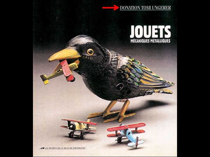 Ses objets-assemblages réalisés avec des matériaux usagés expriment sa vision critique de la société de consommation, et transposent en trois dimensions ses dessins-collages d’inspiration surréaliste. La critique politique est un élément significatif de son œuvre satirique. Des posters protestataires comme "Black Power/White Power" et la série contre la guerre du Vietnam, réalisés dans les années 1960, continuent d’impressionner par la violence de leur message. Tomi Ungerer est un grand témoin de son temps qui n’a cessé de s’engager avec force contre toutes les formes de dictature et d’injustice. Une passion pour les mécanismes Tomi Ungerer est issu d’une famille de constructeurs d’horloges monumentales. Ses aïeux ont collaboré au XIXe siècle avec Jean. Baptiste Schwilgué à l’élaboration de son chef-d’œuvre, la troisième horloge astronomique de la cathédrale de Strasbourg. Enfant, il a pu admirer les automates de l’horloge de la cathédrale de Messine dessinés par son père Théodore et lui-même est devenu par la suite un collectionneur passionné de jouets. Certains d’entre eux sont présentés au Musée des Arts décoratifs de Strasbourg.
