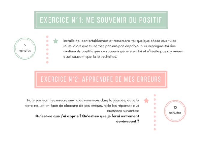 • Écrivez la liste de vos défauts. • Deux options s’offrent alors à vous. Vos défauts vous empêchent-t’il d’avancer ? Vous font-ils souffrir ? Vous ou votre entourage ? À vous de décider ensuite si vous devez les accepter et arrêter d’essayer de les corriger, ou au contraire prendre les choses en main pour lutter définitivement contre eux. • Voici quelques exercices qui peuvent nous aider à développer notre confiance en soi