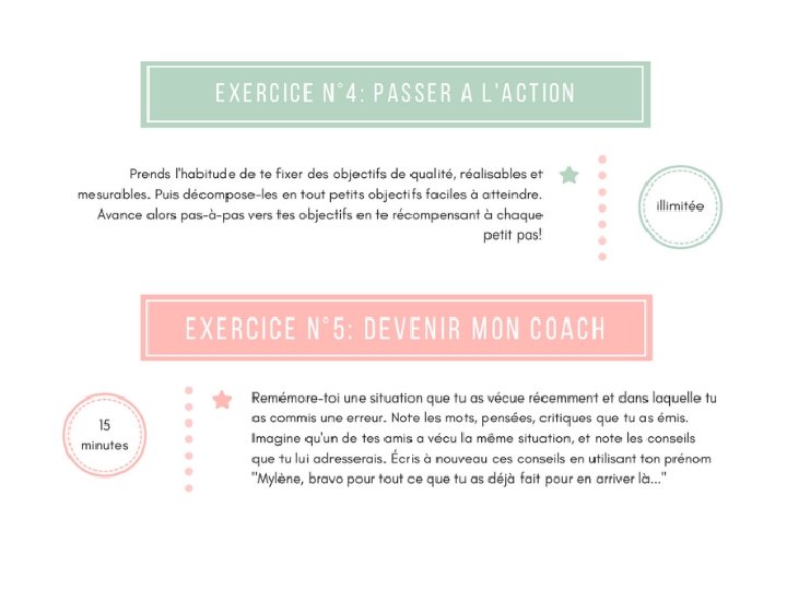 • Installez-vous au calme, avec une quinzaine de minutes devant vous rien que pour vous. • Munissez-vous de votre feuille et de votre stylo et commencez par lister vos qualités. Trouvez-en au moins 10. • Si vous avez des difficultés à vous trouver des qualités, pensez par exemple à ce que vos proches disent régulièrement de vous, et que parfois vous avez du mal à accepter. Car n’avez-vous pas également ce réflexe qui consiste à minimiser systématiquement les compliments que vous recevez? Si c’est le cas, exercez-vous également à accepter simplement les compliments avec un merci et un sourire.