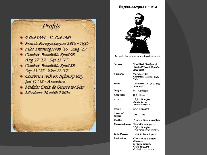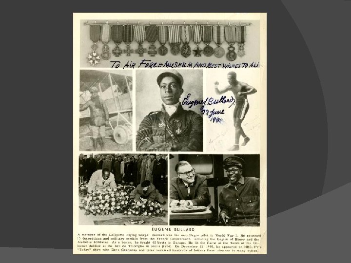 Une vie hors du commun… 1894 -1961 Eugène Jacques BULLARD naquit dans la misère à Colombus ( Géorgie) , il fera son dernier vol dans la misère à Harlem. Il sera inhumé avec les honneurs dans la partie française des anciens combattants du cimetière de « Queens » N. Y.