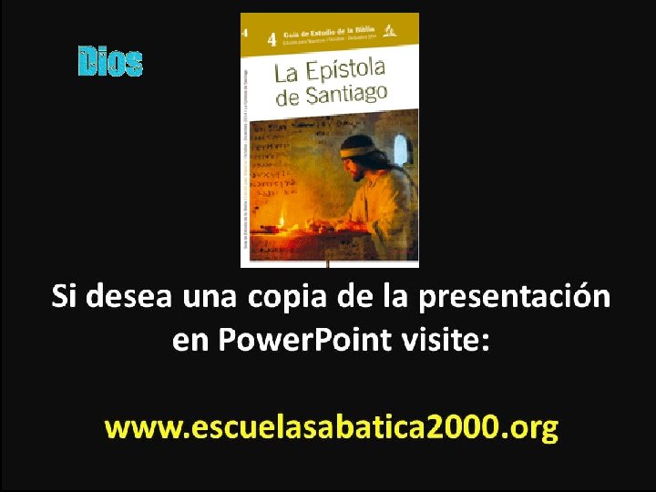 Santiago 3: 13 ¿Quién es sabio y entendido entre vosotros? Muestre por la buena conducta sus obras en sabia mansedumbre. Santiago 4: 8 -10 Acercaos a Dios, y él se acercará a vosotros. Pecadores, limpiad las manos; y vosotros los de doble ánimo, purificad vuestros corazones. Afligíos, y lamentad, y llorad. Vuestra risa se convierta en lloro, y vuestro gozo en tristeza. Humillaos delante del Señor, y él os exaltará. Santiago 4: 7 Someteos, pues, a Dios; resistid al diablo, y huirá de vosotros. Lamentarse delante de Dios Limpiarse y purificarse Acercarse a Dios Resistid al Someteos a diablo Dios Pasiones de De sabia la carne humildad Malos frutos Buenos frutos Terrenal Divina se demuestra con obras Sabiduría
