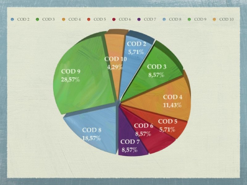 PROGETTI POF (Alcuni progetti sono stati realizzati su più ordini di scuola pertanto il totale dei progetti per singolo codice può non corrispondere con la suddivisione delle tipologie perché presenti in continuità) TIPOLOGIA N° progetti COD 2 Abilità linguistiche letteraturabiblioteca 4 COD 3 Abilità logico-matematiche scientifiche 6 COD 4 Prevenzione disagio-inclusione 8 COD 5 Lingue straniere 4 COD 6 TIC Infanzia Primaria S. S. I. G. 3 2 6 3 5 1 2 6 2 4 COD 7 Attività artistico-espressive 6 2 4 COD 8 Educazione alla convivenza civile 13 2 4 7 COD 9 SPORT 20 2 3 15 COD 10 Accoglienza, orientamento, continuità 3 1 2 1 TOTALE N° PROGETTI 70
