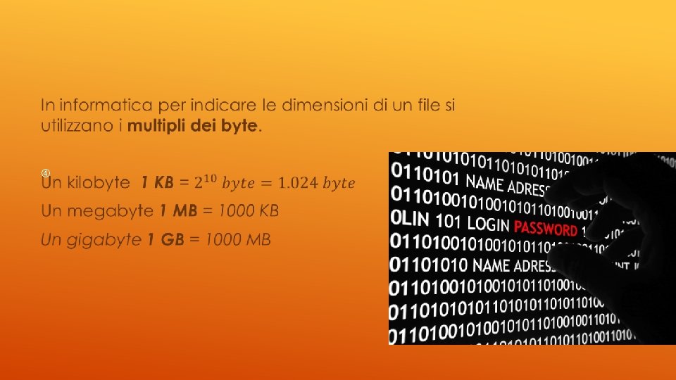 SISTEMA BINARIO Ai nostri giorni, nell’ambiente informatico, si ricorre alla numerazione in base 2, che caratterizzata da due soli simboli : 0 e 1 associati a due stati possibili dei componenti elettronici dei calcolatori. Allo stato aperto si associa la cifra 0, allo stato chiuso si associa la cifra 1. Per rappresentare un numero si utilizza, allora, un sistema posizionale in base due, detto anche sistema binario. Dalla traduzione inglese di « cifra binaria » , binary digit, ognuna di queste caselle è detta bit. Le otto caselle contengono 8 bit e costituiscono una cella di memoria detta byte. 0 1 1