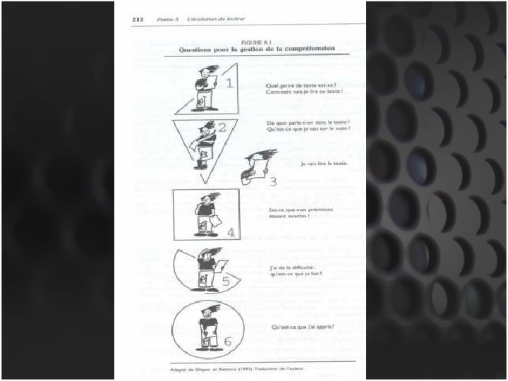 Composantes de la métacompréhension la e d n o i t s Autoge nsion he é r p m o c = habileté du lecteur à utiliser des processus d’autorégulation. = - savoir QUAND nous comprenons (ou pas) - savoir CE QUE nous comprenons (ou pas) - savoir CE DONT NOUS AVONS BESOIN pour comprendre - savoir que nous pouvons FAIRE QUELQUE CHOSE quand nous ne comprenons pas Exercice avec le jeu de carte. (Th. à pr. , p. 154 -6)