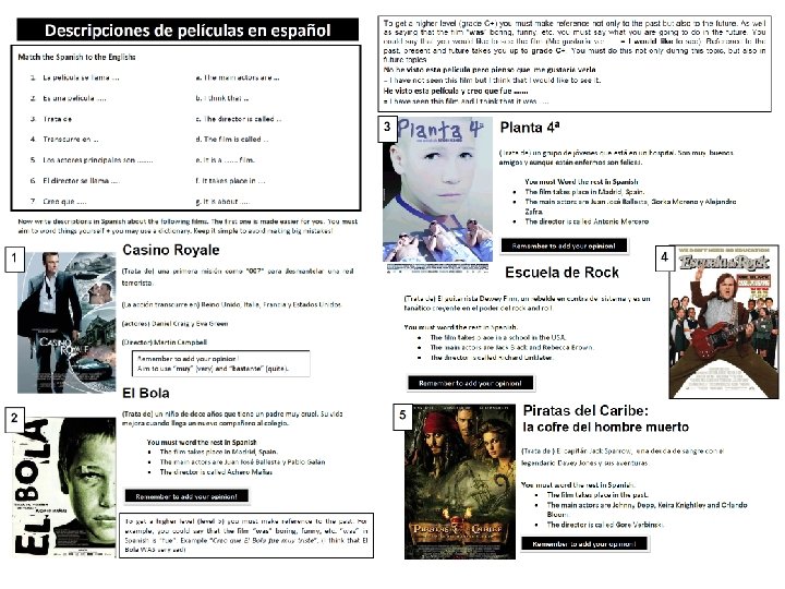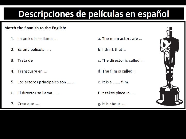 Find the Spanish for: 1. 2. 3. 4. 5. 6. … takes place in … … is called … … takes place in … It is about … … it won … I think that it is … • Es una película de suspense de un director español que se llama Pedro Almodóvar. • La película transcurre en el presente en Madrid y Barcelona. • Trata de la vida de una madre y su vida después de un accidente en el cual su hijo murió. • Una de las actrices famosas de la película se llama Penélope Cruz. • Creo que es una película muy emocionante y ganó un óscar.