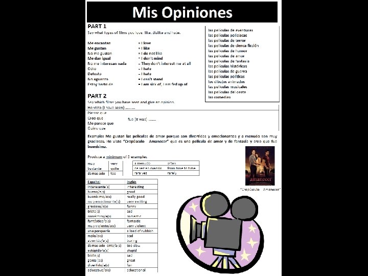 Hola Diego: ¿Qué tipo de películas prefieres? A mí me gustan las películas de ciencia ficción porque son muy emocionantes y divertidas. Mi película favorita es “Avatar” que vi en el cine en enero con mis amigos. ¡Fue genial! No me gustan las películas de dibujos animados porque son tontas e infantiles, pero a mi hermano menor le encantan. ¡Ha visto “El Rey León” ocho veces! Pero las películas que más odio son las películas románticas porque son estúpidas y muy aburridas. El otro día vi “Love Actually” en casa en DVD y me dormí. ¡Qué rollo! Antonio Find the Spanish for the following from the text above: 1. They are very exciting = …………… 2. My favourite film = …………… 3. I saw = ………………… 4. It was great! = ………… 5. because = ………………… 6. he loves them = ………………… 7. 8 times = ………………… 8. very boring = …………………. . 9. I fell asleep = …………………