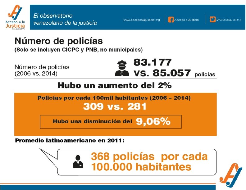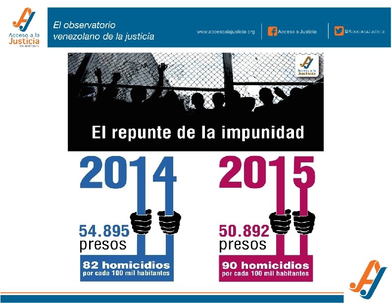 1. Jueces y fiscales no cuentan con la estabilidad necesaria para garantizar su independencia política. 7 jueces y fiscales por cada 100. 000 h, 9 y 7 promedio AL, 2011 2. El número de policías ha disminuido, 309 (2006) vs. 281 (2014). 368 por 100. 00 h en AL, 2011. 3. Menos presos, más delitos: 2014, 54. 895 presos (82 homicidios 100. 000 h) y 2015, 50. 892 (90 homicidios 100. 000 h). 4. Hay muchos menos recursos asignados al sistema de justicia, menos del porcentaje del 2% constitucional: 1, 6% en 2015 y 0, 63% del PIB en 2014. 5. Aún así, hay más recursos dedicados a instituciones represivas (policías, cárceles), y menos a las que garantizan derechos (Defensoría del Pueblo), inician (Ministerio Público) o tramitan y concluyen procesos judiciales (Poder Judicial). 6. 70% de los delitos no se denuncian. 7. El MP solo lleva al Poder Judicial el 14% de los delitos reportados por la policía. 8. El Poder Judicial solo sentencia el 11% de los delitos que le lleva el MP. 9. La administración de justicia penal es cada vez menos eficiente. 10. En 2015 había menos presos que en 2014 aun habiendo más delitos.