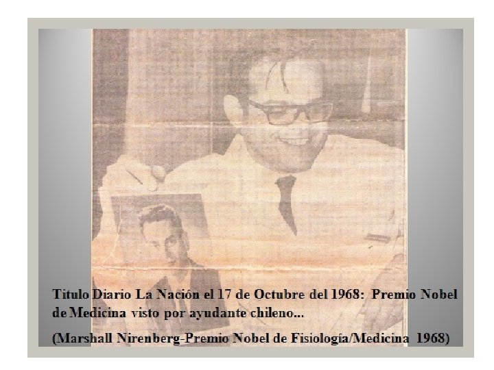 Mi clase de Medicina de 1961 AÑO DESCUBRIMIENTO 1960 Teoría del RNA mensajero Jacob* y Monod* La Estatua Interior 1987 Tomando Té el Viernes Santo de 1960 en la casa de Brenner 1961 Uuu es fenilalamina Piedra Rosetta del código Mi fracaso como futurologo 1961 -1965 Se completa el código genético INVESTIGADORES M. Niremberg*, Ochoa*, Khorana* 1962 -1967 Mecanismo de traducción para Lipmann* y varios síntesis de proteínas. laboratorios Mi participación en el laboratorio Lipmann y posteriormente en el de Niremberg