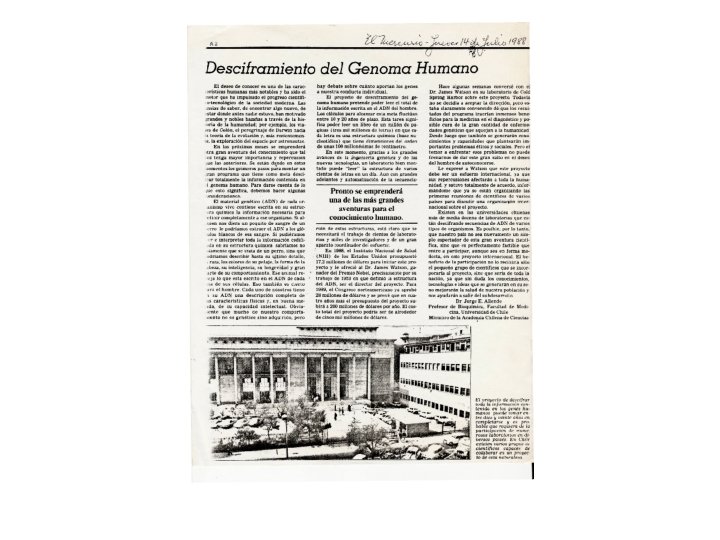 2001 • La gran sorpresa que nos dio el texto completo de las secuencias del genoma es que el ser humano solo tiene ~ 26000 genes que es igual al de los ratones y mucho menos que algunas plantas y animales. Golpe a nuestro orgullo. Solo el 3% del Genoma codifica para proteínas. • Esto nos presentó con el concepto del “DNA basura” y que la complejidad humana no se basa en genes sino más bien en sus interrelaciones.