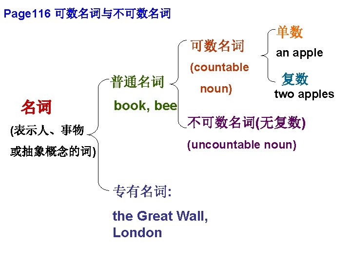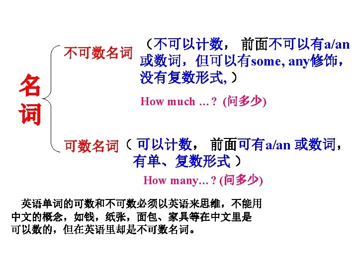 不可数名词 (uncountable noun) ( 不可以计数, 有单数形式,但没有 复数形式 ), 可以和some连用 milk, water, juice, meat , oil, tea, coffee paper, money, bread, furniture a bottle / glass / cup / kilo / bowl / bag / packet / carton of…