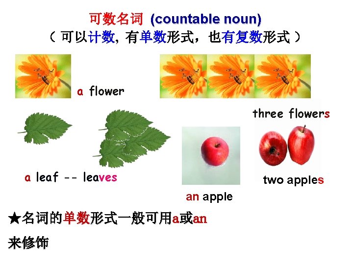 Tell the meanings of the red words in the sentences: 1. The glass is made of glass. (玻璃, u) (玻璃杯, c) 2. 2. Is there enough room in this room? (空间, u) (房间, c) 3. 3. Writing is hard work. ( 作, u) 4. 4. Many teenagers like the writer’s works. (著作, 作品, c) 5. 5. People cut down many trees in the woods (森林, c) (木材, u) 6. to get wood. 7. 6. It’s time for a break. Let’s stop doing math 8. exercises and go out to do exercise. (练习, c) (运动, u)