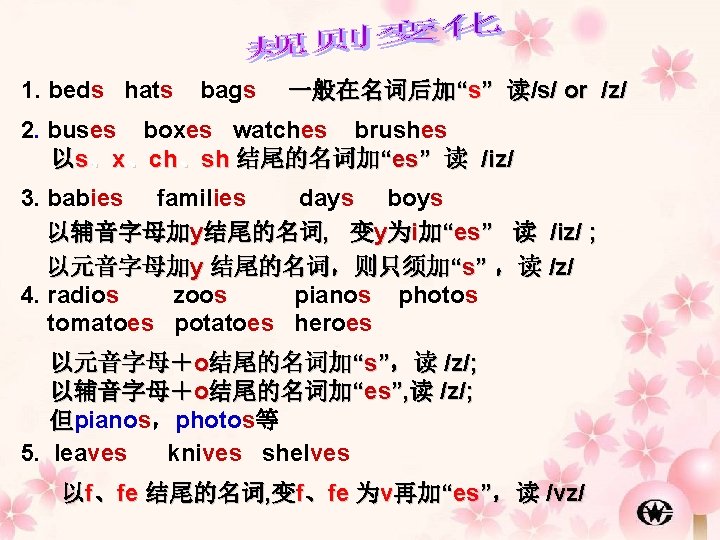 6. man—men woman ---women policeman—policemen Frenchman--Frenchmen 特殊: German ---Germans (德国人) 7. child—children tooth—teeth foot ---- feet goose ---- geese 8. fish sheep Chinese 9. shoe shops, Japanese (单复同形) men writers, women singers 一些合成名词的复数构成分两种情况 (1)将中心词变为复数 pen friend- pen friends (2) man, woman 构成的合成词, 每个名词都要变成复数 two women nurses three men doctors