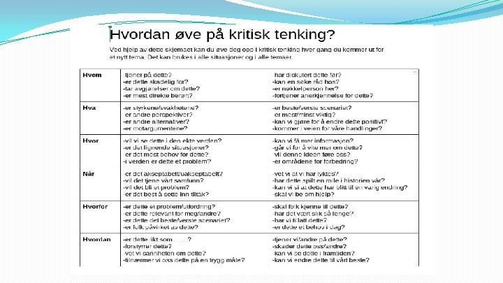 5 pedagogiske prinsipp: 1. Kritisk tenkning som et mål, et læringsutbytte og en metode i undervisningen. 2. Elevene skal kunne identifisere seg med temaet (førkunnskap). 3. Ta del i sosiale hendelser utenfor klasserommet (viktig/nyttig? ) 4. Dialogisk tilnærming - læreren overfører ikke en sannhet, vi finner en sammen. (involvering, motivasjon og engasjement - krever at vi slipper opp noe av kontrollen!) 5. Prioriter en formativ tilbakemelding/vurdering, fremfor summativ. (En forventning hos læreren om å delta og dele tanker og spørsmål. )