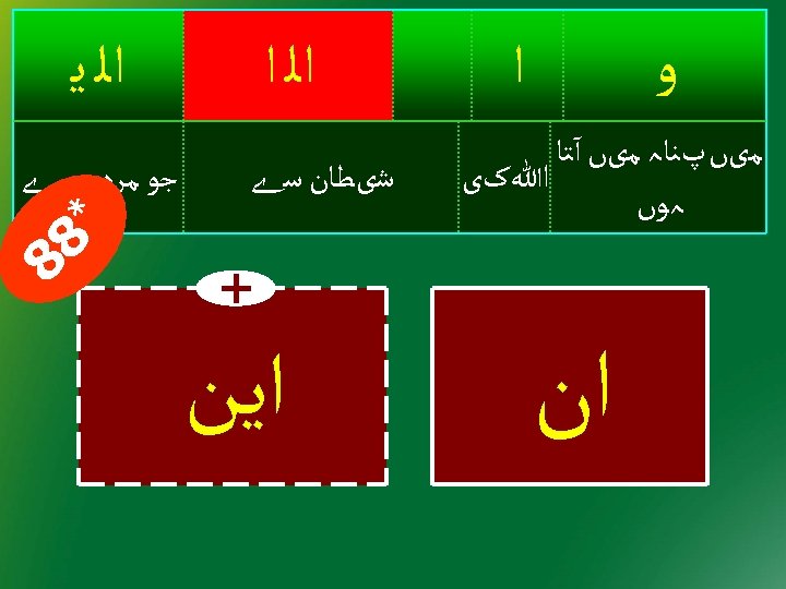 ﺍﻟ ﻳ the outcast. ﻭ ﺍ ﻭ ﷲ ﺍﻟ ﺍ Satan, from in I ﺫ take ﻉﻭ Allah refuge I take refuge ‘safety first’; ‘buckle up’; Get protection
