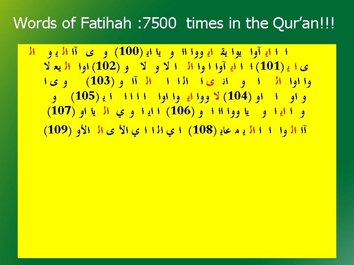 In this lesson… Qur’an: Al-Fatihah (Verses 1 -3) Grammar : ﻥ , ﺳ Educational tip: Create flashes in the brain In this lesson you will learn 7 new words which occur in Quran almost 3184 times