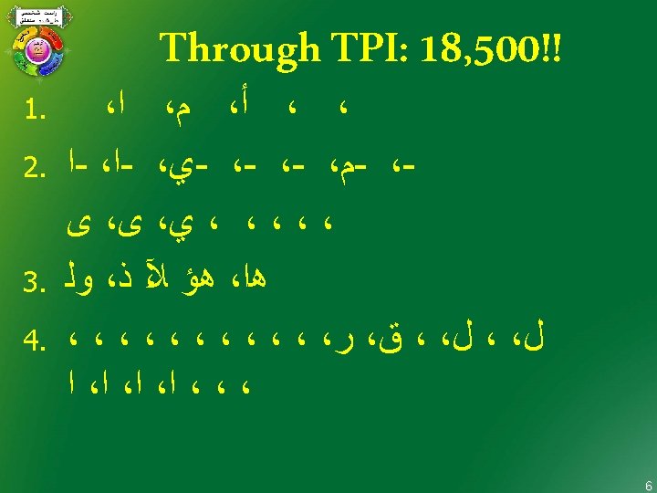 Use TPI !!! q Use your whole. q No ‘joke’. q It is a full system q Follow it from now… for thousands q Don’t let Shaitaan stop you “I will do it later”. 5