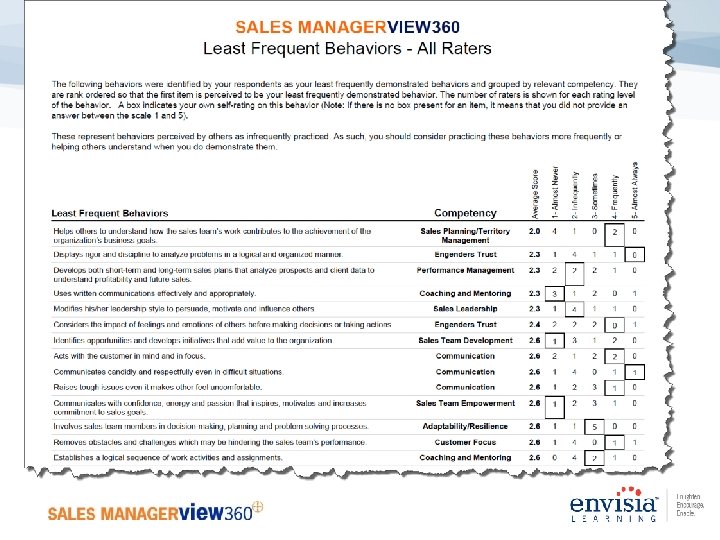 Sales Manager View 360 Most Frequent/Least Frequent Section KEY POINTS § The “Most Frequent” section and “Least Frequent” section summarizes those competencies and behaviors that were most frequently/least frequently observed by various rater groups § The number in the first column corresponds to the average score for all raters providing feedback (1 to 5 scale) § The “Most Frequent” should be considered as perceived strengths to leverage and build on § The “Least Frequent” should be considered as possible behaviors to practice more frequently