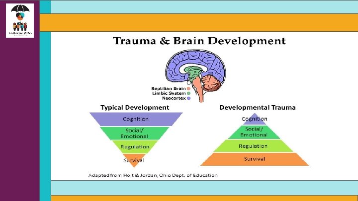 Trauma’s Impact on Brain Development • Attachment: Trouble with relationships, boundaries, empathy & social isolation ● Physical Health: Impaired sensorimotor development, coordination problems, increased medical problems & somatic symptoms ● Emotional Regulation: Difficulty identifying or labeling feelings and communicating needs ● Dissociation: Altered states of consciousness, amnesia, impaired memory ● Cognitive Ability: Problems with focus, learning, processing new information, language development, planning & orientation to time & space ● Self-Concept: Lack of consistent sense of self, body image issues, low self-esteem, shame & guilt ● Behavioral Control: Difficulty controlling impulses, oppositional behavior, aggression, disrupted sleeping & eating patterns, trauma reenactment Source; Cook, A. , Spinazzola, P. , Ford, J. , Lanktree, C. , Blaustein, M. , Cloitre, M. , et al. (2005). Complex trauma in children and adolescents. Psychiatric Annals, 35(5), 390 -398.