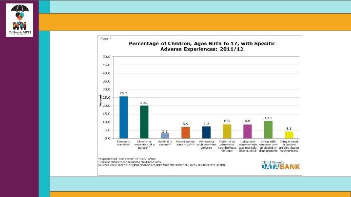 Adverse Childhood Experiences (ACEs) Study • Partnership b/w Kaiser Permanente and CDC • The initial surveys began in 1995 and continued through 1997, with the participants followed subsequently for more than fifteen years. • Retrospective approach examined link between multiple types of childhood stressors and adult health for over 17, 000 adult participants • Questionnaire asked for detailed information on past history of abuse, neglect and family dysfunction as well as current behaviors and health status. .