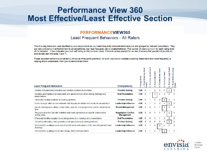 Performance View 360 Most Effective/Least Effective Section KEY POINTS § The “Most Effective” section and “Least Effective” section summarizes those competencies and behaviors that were most frequently/least frequently observed by various rater groups § The number in the first column corresponds to the average score for all raters providing feedback (1 to 5 scale) § The “Most Effective” should be considered as perceived strengths to leverage and build on § The “Least Effective” should be considered as possible behaviors to practice more frequently