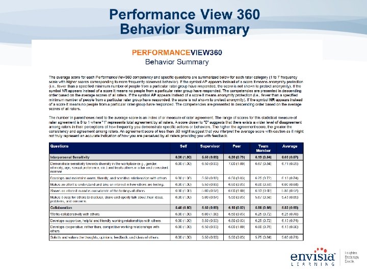 Performance View 360 Behavior Summary KEY POINTS § Each Performance View 360 question is summarized and categorized in its appropriate competency § Average scores across all raters are reported for each competency and question § A statistical measure of rater agreement based on the standard deviation is reported as a percentage—a score less than 50% suggests that the raters providing feedback had enough disagreement to warrant a cautious interpretation of the average score reported (e. g. , raters had diverse perceptions and rated the participant quite differently on that question or competency)