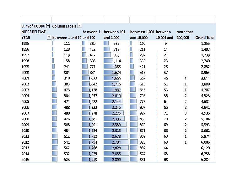 Sizes of NIBRS Segments John Jay NIBRS Relational Database Segment Type Record Counts Columns (fields) (in millions, first 7 rows) ’ 95 -‘ 05 ’ 95 -‘ 08 ‘ 95 -’ 15 1. Administrative 29. 1 44. 1 79. 7. 17 2. Offense 31. 9 48. 4 87. 9 26 3. Property 33. 3 50. 7 93. 8 25 4. Victim 31. 7 48. 2 88. 0 55 5. Offender 32. 9 50. 0 90. 8 12 6. Arrestee 8. 0 12. 4 23. 9 21 7. Group B Arrest 9. 9 14. 6 26. 5 19 8. Window Exceptional Clearance 11, 502 16, 611 38, 357 27 9. Window Recovered Property 7, 086 11, 074 18, 952 35 10. Window Arrestee 156, 791 179, 559 241, 187 32