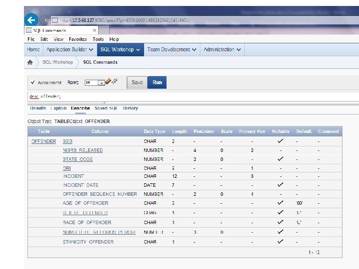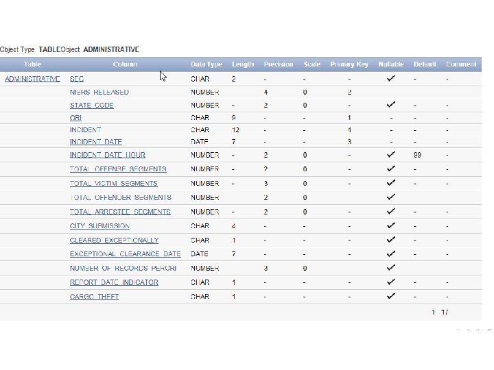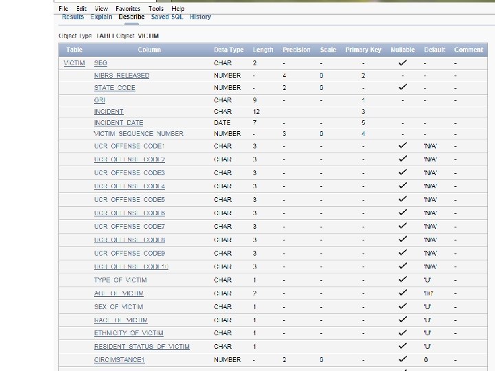 NIBRS Relational Database • 59 Tables – 13 Segments + Codebook • Enforces referential integrity – important when uploading new data • Provides SQL query capability and processing capabilities (indices, partitioning, etc. ) • Extract required data and relationships • Viewing and reporting tools