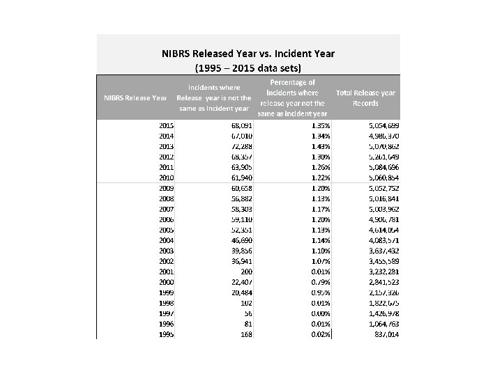 NIBRS Unknown Murder Victim Information (1995 -2015) 1995 1996 1997 1998 1999 2000 2001 2002 2003 2004 2005 2006 2007 2008 2009 2010 2011 2012 2013 2014 2015 victims 458 643 749 975 1230 1695 1958 2053 2132 2358 3320 3404 3420 3252 3457 3430 3544 3689 3551 3596 4234 Unknown age 6 13 18 39 34 82 85 95 65 104 122 111 97 97 79 46 47 52 57 49 58 1. 31% 2. 02% 2. 40% 4. 00% 2. 7% 4. 84% 4. 34% 4. 63% 3. 05% 4. 41% 3. 67% 3. 26% 2. 84% 2. 98% 2. 29% 1. 34% 1. 33% 1. 41% 1. 61% 1. 36% 1. 37% Unknown race 6 7 10 21 27 52 49 53 52 58 76 66 62 93 54 49 77 62 57 73 71 1. 31% 1. 09% 1. 34% 2. 15% 2. 20% 3. 07% 2. 50% 2. 58% 2. 44% 2. 46% 2. 29% 1. 94% 1. 81% 2. 86% 1. 56% 1. 43% 2. 17% 1. 68% 1. 61% 2. 03% 1. 68% Unknown gender 0 3 0 7 6 17 15 15 7 21 13 25 16 28 8 9 13 11 14 23 14 0. 00% 0. 47% 0. 00% 0. 72% 0. 49% 1. 00% 0. 77% 0. 73% 0. 33% 0. 89% 0. 39% 0. 73% 0. 47% 0. 86% 0. 23% 0. 26% 0. 37% 0. 30% 0. 39% 0. 64% 0. 33%